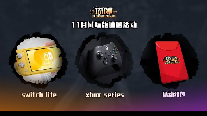 11月PC试玩版速通有奖活动预告(36名)1,switch lite+随机箱子密码2,XBOX SERIES手柄+随机箱子密码3,琉隐红包(20-200)+随机箱子密码注:上次参与活动未中奖的小伙伴可以累积抽奖次数。感谢大家长久来的支持,11月内揭晓活动内容规则,后续游戏上线后也会定期在群内开展PC版和移动版的活动作为对玩家老爷们支持的回馈。感谢大家的陪伴才使得游戏变得越来越丰富,同时PC版发售日期与售价也将在本月内公布,还请期待。