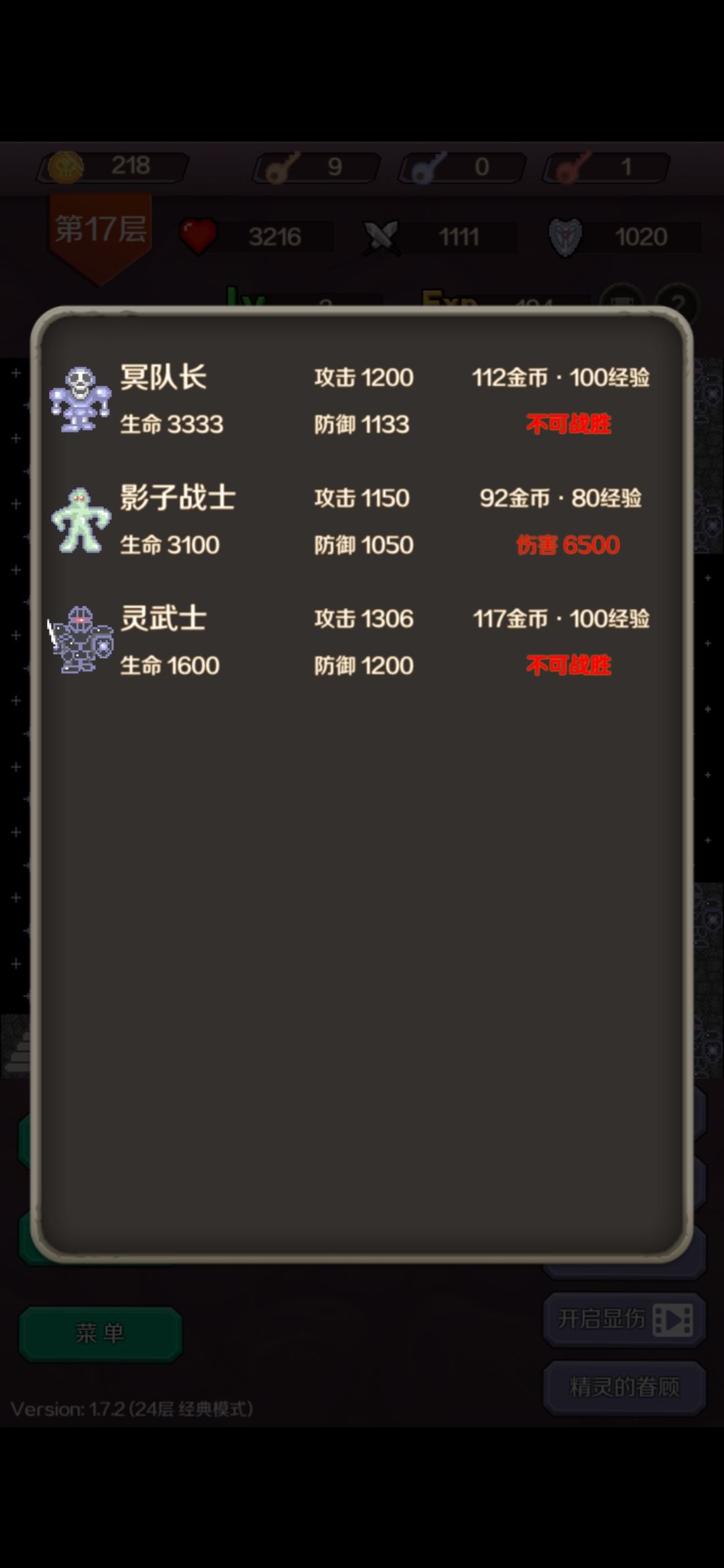 原版完美路线如上帖所示。本版在防杀17F冥队长后的操作和原版基本一致,可自行探索。现放出开局到防杀冥队长的流程,建议每个阶段存档: 一、经验老人 1F:取红钥匙开红门;杀2绿头怪-100、红头怪-40,剩下860;取黄钥匙1;上3F 3F:杀小蝙蝠-190、2绿头怪-100,剩下570;开黄门杀骷髅人-315、红头怪-40,剩下215;取黄钥匙3、铁剑+10=20ATK;杀2小蝙蝠-120、红头怪
