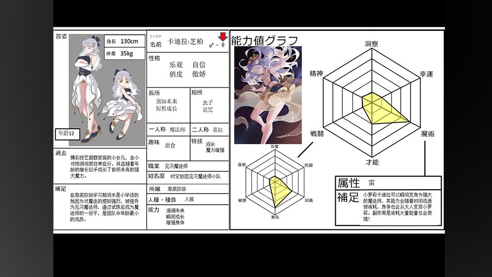 小天才的傲娇少女,可以通过自身的魔力流动让自己成长或变小,弱点是容易肚子饿。 同时也正在修炼让目标的时间变长与缩短的奥秘。