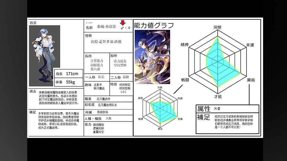 拥有解除时空枷锁的能力,但自身已经成为高规格的魔法师,不与其他见习[时空旅团]的魔法师共享时间枷锁(所以他的字段中没有 时空团。)