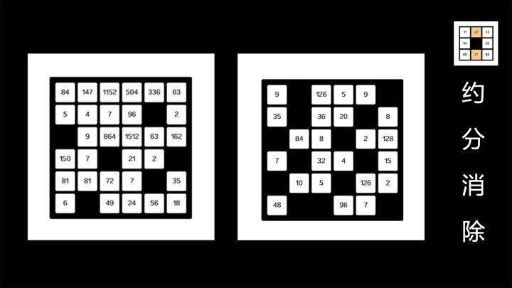 【规则】点击两个带有数字的格子,两个格子将同时除以对应两个数字的最大公约数,若某个格子数字变为1则该格子被消除。