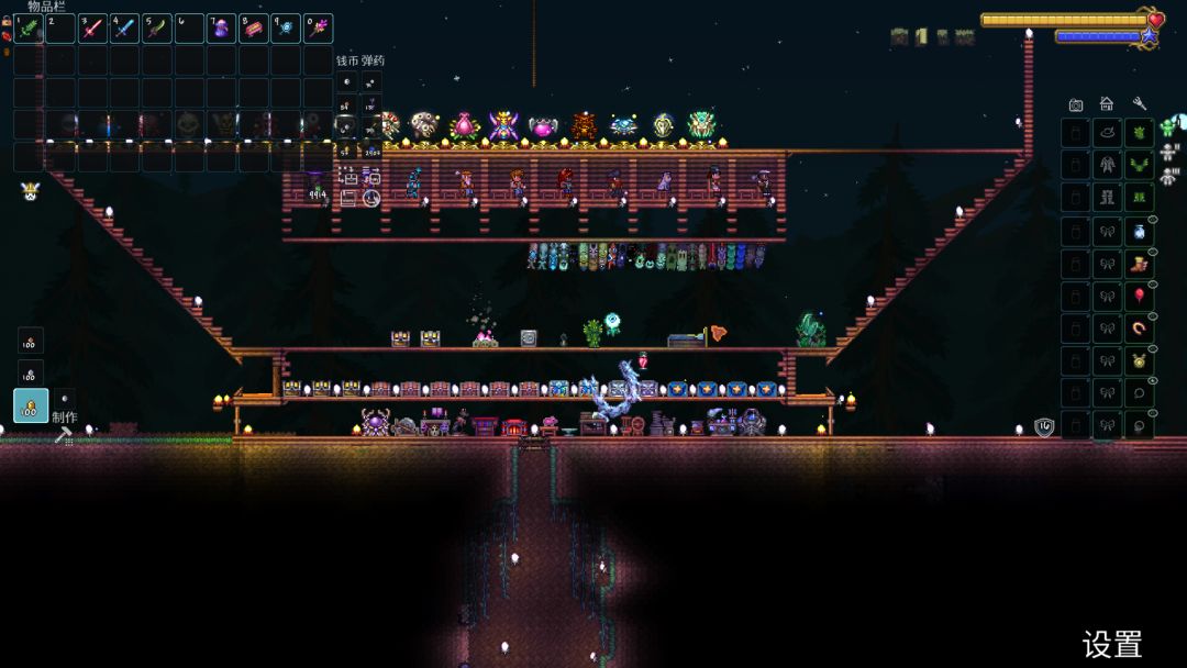 前期白天去搜集各种武器资源晚上下矿然后金套了后就去丛林把草剑肝出来再弄黑耀石皮肤药水去地狱4分钟内挖狱岩矿把烈焰剑弄出来再弄熔岩套然后去祭坛和成永夜之刃肉前无敌再去丛林刷蜂后刷蜜蜂手雷,养蜂人之刃,坐骑骑坐骑上空岛找星怒然后去地狱搭平台打肉山开启困难模式再去砸祭坛开新三矿弄钯金镐挖秘银造秘银镐然后挖精金合成精金熔炉造精金套然后打新三王弄神圣套神圣镐顺便把永夜之刃升级成真·永夜然后造出神圣镐头去丛林