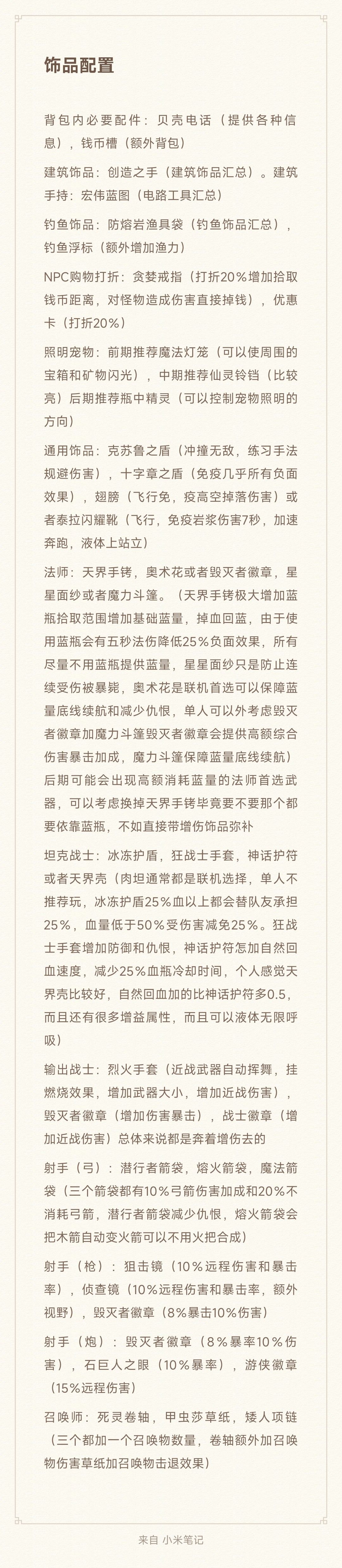 按职业功能是否联机的饰品配置,都是毕业饰品,可以慢慢收集,用功能类似的饰品过度或者半成品饰品过度#泰拉瑞亚攻略 #泰拉瑞亚萌新发展思路