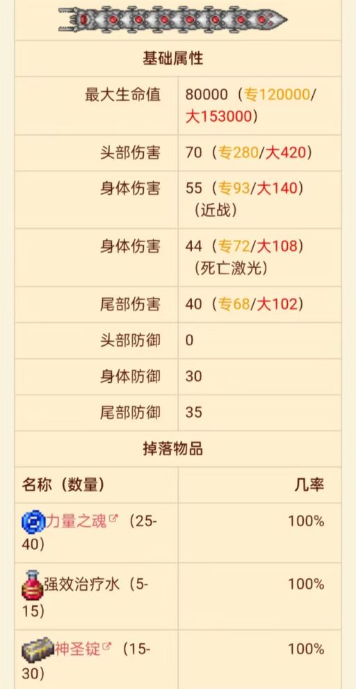 毁灭者(机械蠕虫),一只升级版本的世界吞噬者,与真正的世界吞噬者相比较,虽然外观很相似,但毁灭者(机械蠕虫)不会分裂成一小节一小节。 召唤方式 1. 当你打败肉山之后,但是没有打过毁灭者(机械蠕虫)的时候,机械蠕虫每晚可能随机生成; 2. 使用道具“机械蠕虫”召唤(虽然机械蠕虫道具和机械蠕虫boss重名了,但是机械蠕虫道具的原版英文名是Mechanical Worm,而机械蠕虫boss的英文名则是
