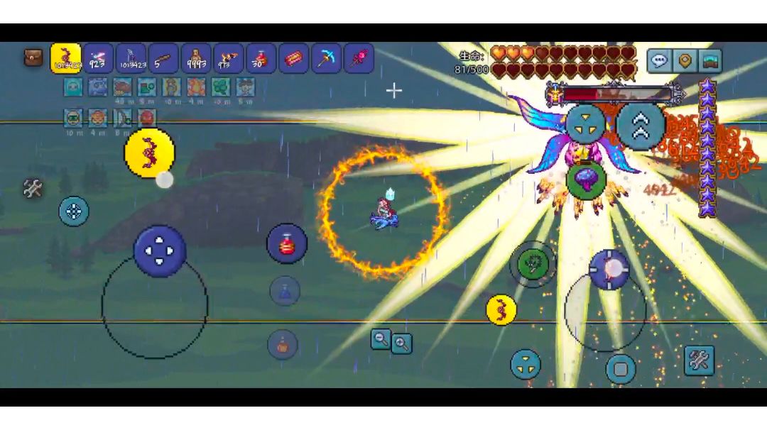接下来的话就是克苏鲁之眼 啊 说实话 感觉有点摆烂了 其实想用那个 夺命枪过来着 但是要记住一点 打boss过程中 要你命的往往不是boss本体 而是刷新出的那些小怪 夺命枪小怪的确清不过来 所需物品:任意一个二连跳瓶,任意一个鞋子,迷你鲨,四管猎枪 视频中所用四管猎枪打第一阶段 是为了快速时期进入第二阶段 其实只需要一把武器就够了 理论上来说 这玩意儿比史莱姆王都好打 打史莱姆王和这个的时候都没
