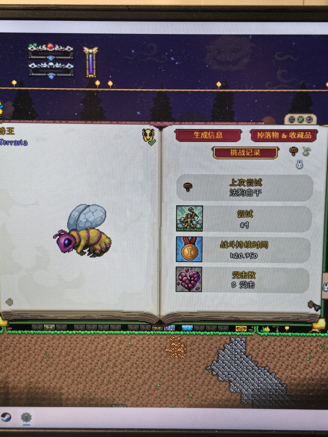 肉后的第二个boss,这次无伤真是惊心动魄一样 大部分弹幕都是看上去打到了实际没有 因为最后有我最后被小怪秒杀的画面 这连我东西都来不及捡,装备饰品也来不及开 用的都是打猪鲨时候的装备饰品 只是药水少了脚蹼和水上漂 或许之后的无伤对我来说越来越难了(可恶😤)