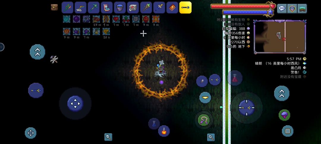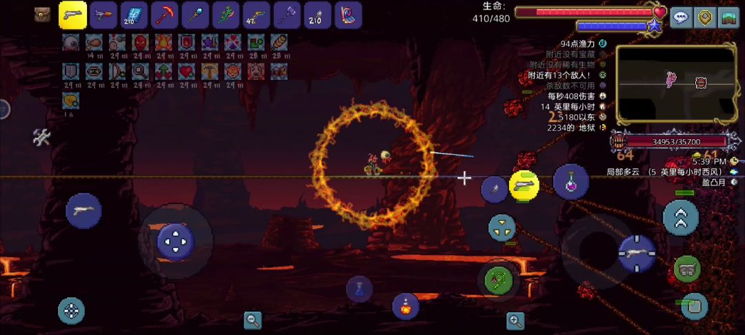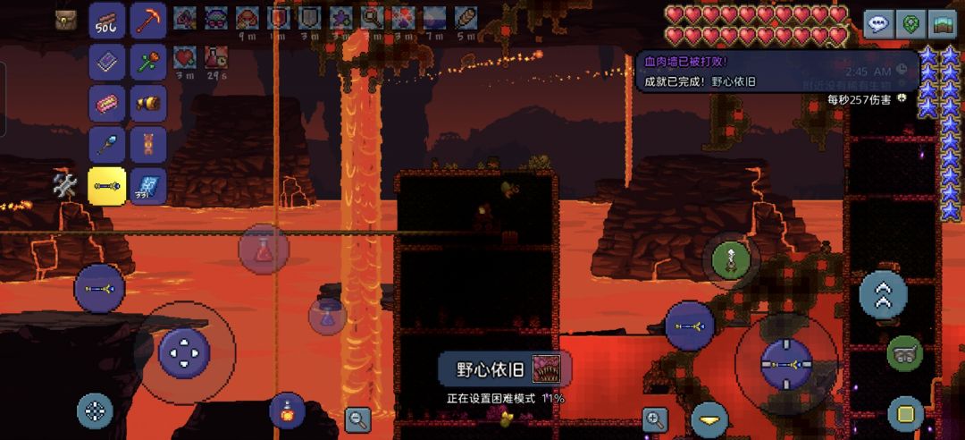 接上回,我拿到钥匙后去地狱开了几个箱子,找到了火之花和烈焰火鞭。这次开荒我就不回地牢找钴护盾和魔法飞弹了,因为听说裂天剑的弹道比较邪门。在游商处买了套神秘长袍和帽子,还刷到把灰冲击枪,挺好用的感觉。这是我第一次玩法师,所以肉前准备要充足一些,做了个刷怪场,效率还行,又找到微光放置晶塔。准备工作就绪、直接到地狱铺平台打肉山,输出武器选蜜蜂枪,饰品加个鲨牙,药水拉满(图7我不是药神)直接开打。结果平台
