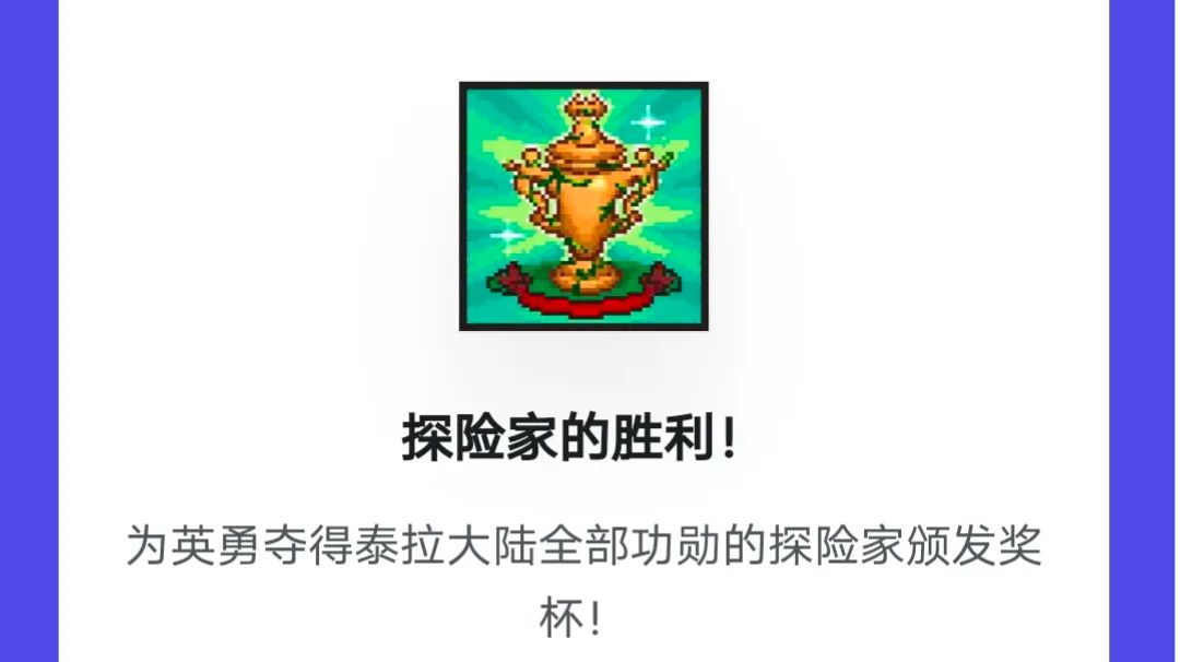 探险家的胜利奖杯镇楼 绝大多数泰拉玩家的第一个成就 探险的途中往往伴随着各种意外 宝箱不一定是宝藏,也有可能是陷阱 第一次遇到宁芙,都会被它伪装的外表迷惑 泰拉瑞亚里隐藏的特殊挑战 不会有人完成200次还没出渔夫三件套吧? 谁能拒绝拥有传送能力的万能辅助呢? 跑的最快的鞋子 肉后必须收集合成的饰品 目前最强武器,没有之一 不取巧的话,很难完成 没有人会在溺水时喝水吧? #心动独立游戏 #XD独立游