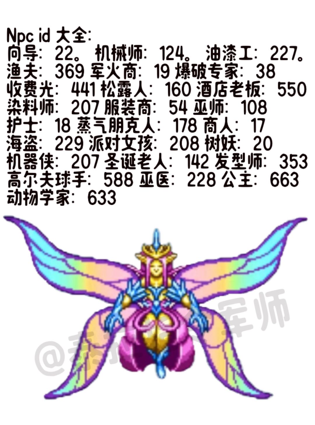 新手必读:指令需在多人模式中使用,选择一张不要的地图,将设置好的角色和地图上传云存档,在多人游戏中创建房间,在别人不给你权限的情况下只能自己开房间玩指令 一、召唤NPC 指令:/sm/spawnmob id 数量(最多 200) 常用npcid:4克苏鲁之眼,13世界吞噬怪,17商人,18护士,19军火商,20树妖,22向导,35骷髅王,37老人,38爆破专家,50史莱姆王,54服装师,68地牢守