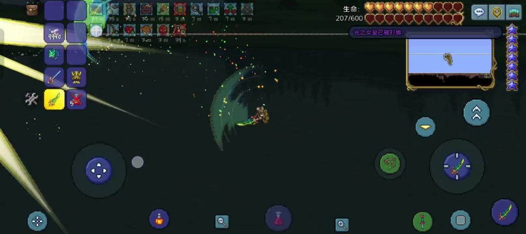 装备配饰如图 甲虫防御套堆肉太管用了 硬吃激光才掉100血 喝了生命上限药能有600血容错巨高 药品上图也有 武器就星璇机枪叶绿弹 摆几个心雕像给红心配吸心药水很舒服 小弹幕能躲就躲 猪鲨翅膀水平移动也很快比较好用 主眼睛的激光就往头部反方向飞很好躲 二阶段就拉远硬扫 药能留就留 去碰心雕像给的红心回血 药留着保命 晚上打触发天界壳变狼人也有加成 如果有猪鲨坐骑可以下雨天打 那个加速月总追不上的 第