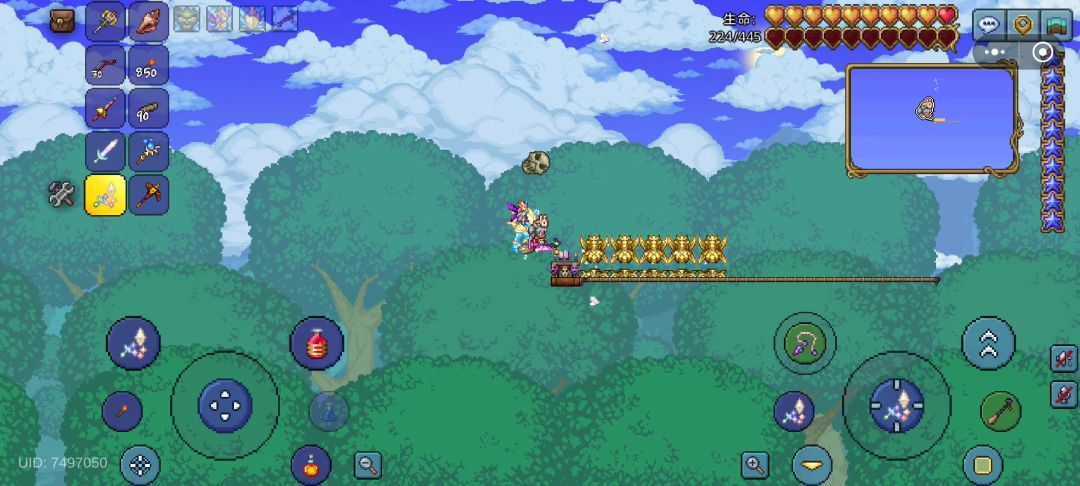 首先是装备方面,我选择的是精金套和蜘蛛套,召唤物在打双子魔眼和铁吴克的时候不是很重要。但是在打毁灭者的时候必须要配上召唤物一起,不然很容易就会被毁灭者放出的小怪磨死。 武器方面刷把代弓出来就可以。骸骨弓是我在刷光明之魂的时候掉的,可以用来打铁吴克。脸黑一点的刷个玛瑙爆破枪或者买个悠悠球也行。至于弹药用的是咒火弹。 接下来就是最重要的地形。新三王里用逃课打法最简单的其实是毁灭者,只要如图在空中搭一个