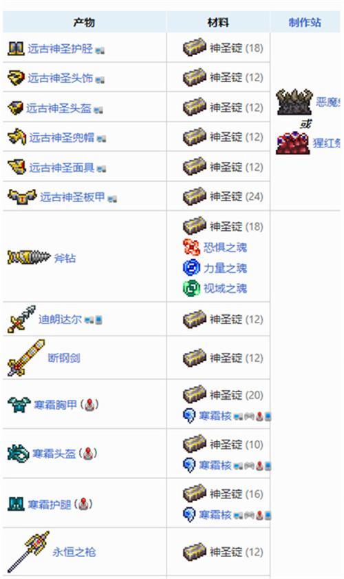 泰拉瑞亚-神圣锭合成物品表