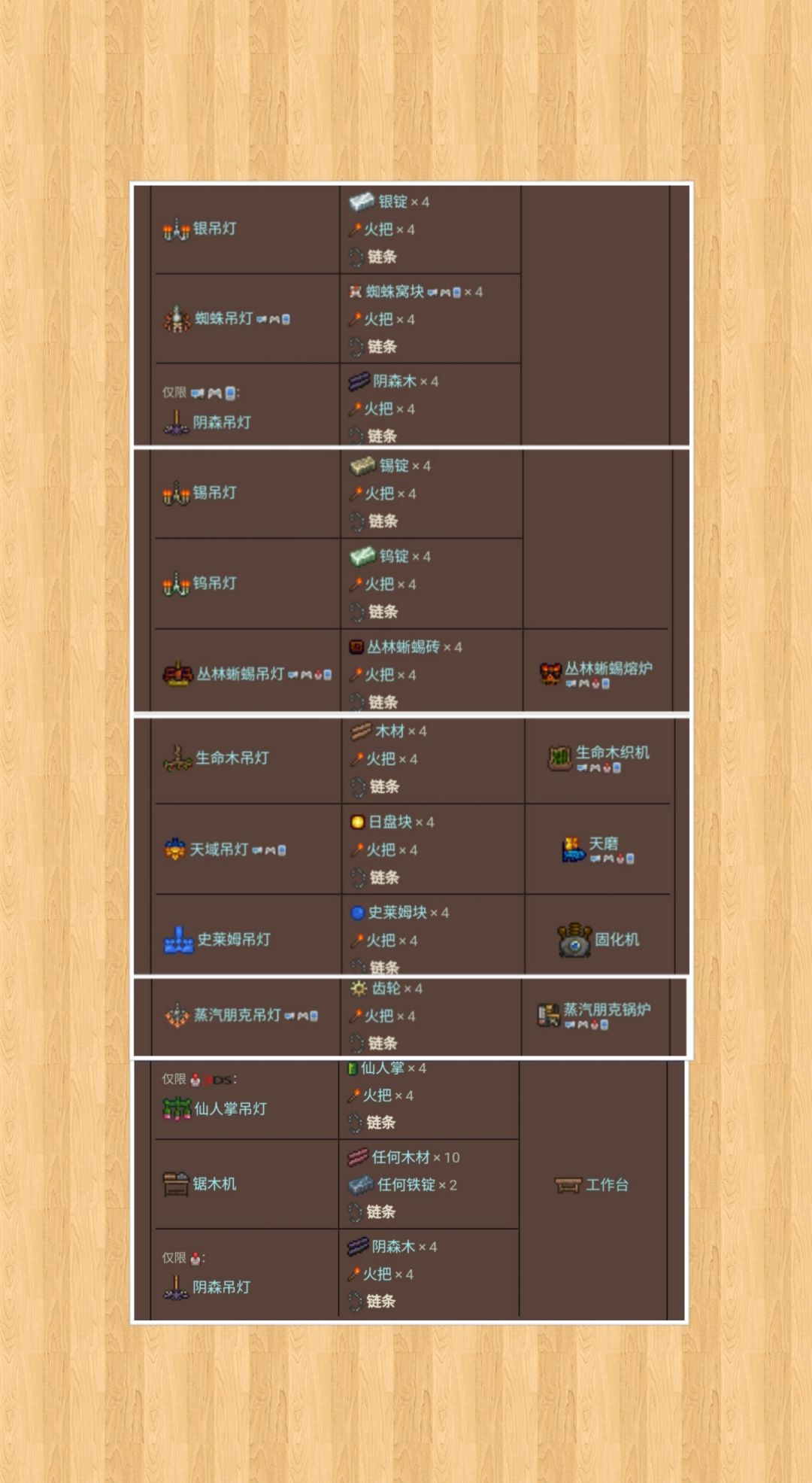 特意去集合了一下,带链条的吊灯 有图,有合成所需要东西和条件 方便建造房屋时,撘配样式和颜色 一目了然 刚开始建造大型建筑,第一次发帖 多多支持😁😁😁#泰拉瑞亚#攻略#游戏攻略#新手攻略