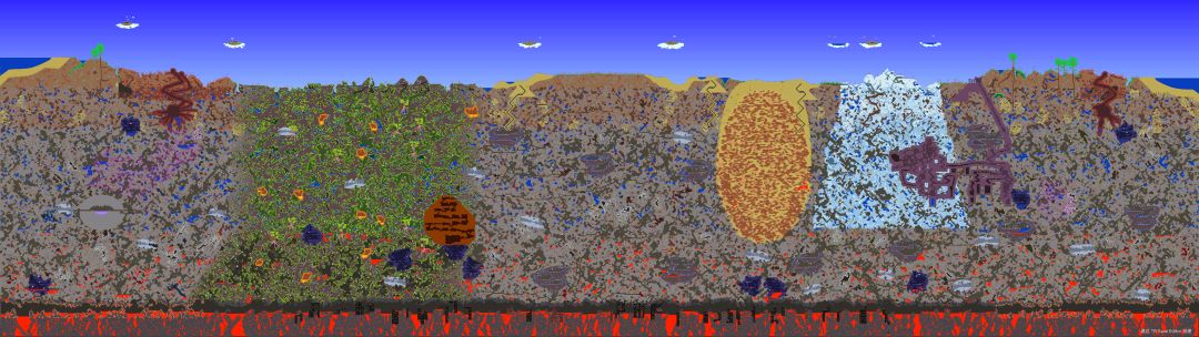 种子号: 1788996476 中世界,猩红。有三个金字塔,4把附魔剑(一个剑冢,三个野生),雏翼,熔岩护符,海螺,水上飘鞋,玻璃钢钓竿,花鞋,该有的全都有。环境分布合理,出生点附近无猩红,适合开荒,并且出生点地面较为平整,非常适合建家,有自然生成的长铁轨。 唯一一个小小的不太好的地方就是猩红和丛林太近,可以前期去左边用物块或向日葵挡住,控制腐化蔓延。 为了方便给大家看,把图片弄出来了,图一