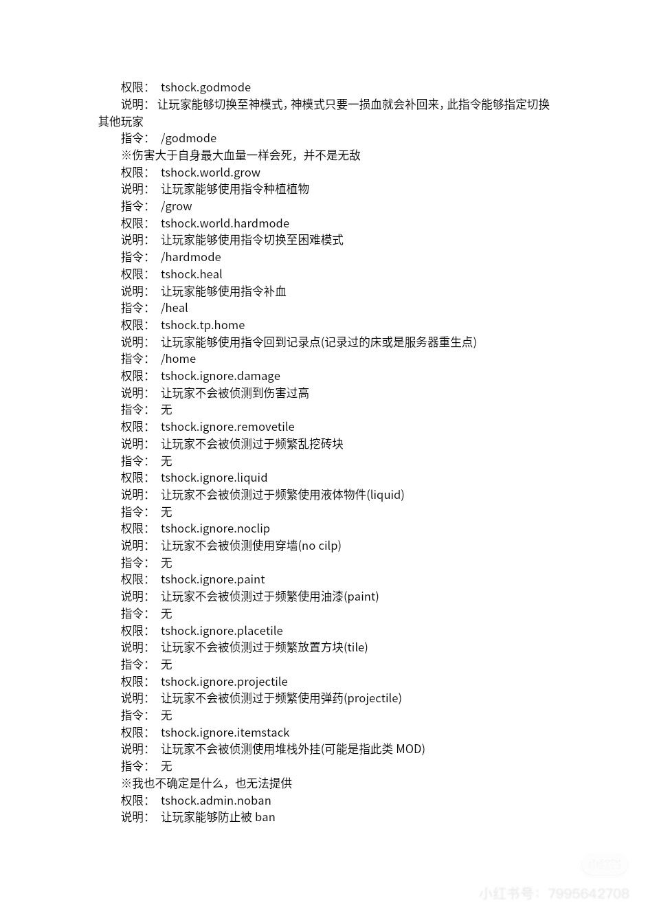前言:权限表摘自网络并有所修改 您可以使用"/group addperm 权限组 权限名称"来添加权限 删除权限为"/group delperm 权限组 权限名称" 您可以搭配指令表中的用户组名称来使用 指令表连接↓↓↓ ———————————————— 权限表下的指令为"None"的表示没有对应指令 tshock.annoy 用户可以骚扰他人。 命令:annoy, rocket, firewor