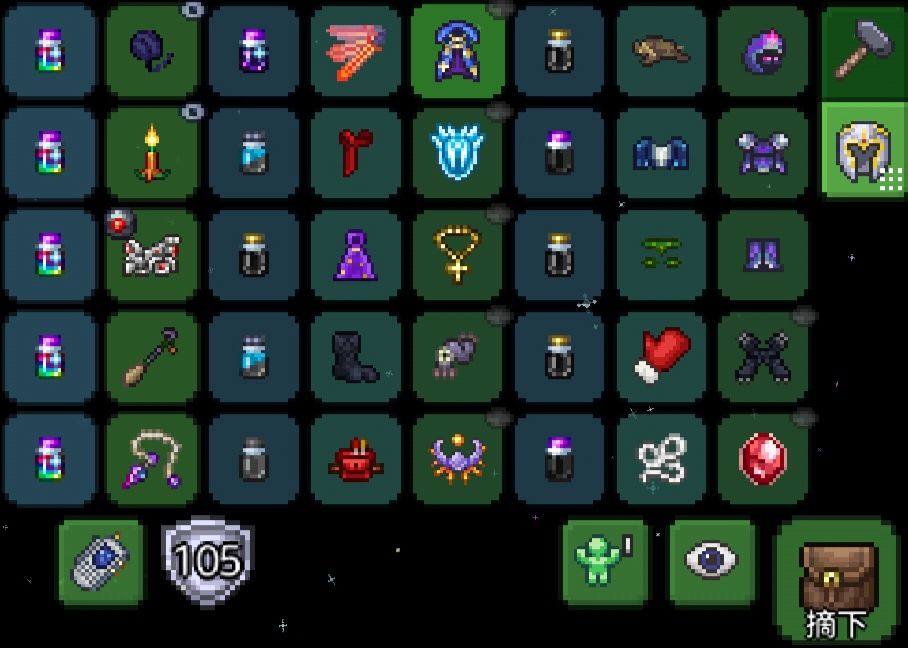 套装 超亮头盔+挖矿衣+挖矿裤,超亮头盔是用挖矿头盔+夜视头盔(花岗精和花岗岩巨人概率掉落或花后机器侠售卖),整个套装加30%的挖掘速度,提供照明效果并加强夜视力 饰品 泰拉靴加机动,综合性能强,适合在各个地方挖坑的地鼠 创造之手提供各种挖掘和建造的加成,还能打boss(误) 工具腰带加1物块放置范围 工具箱加1放置范围和工具使用范围 翅膀够用就行,这里选猪鲨翅膀,不会减少在液体中的移速 飞升之证