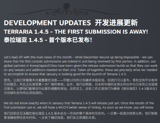 泰拉瑞亚新版本开发完工 终于要来啦!