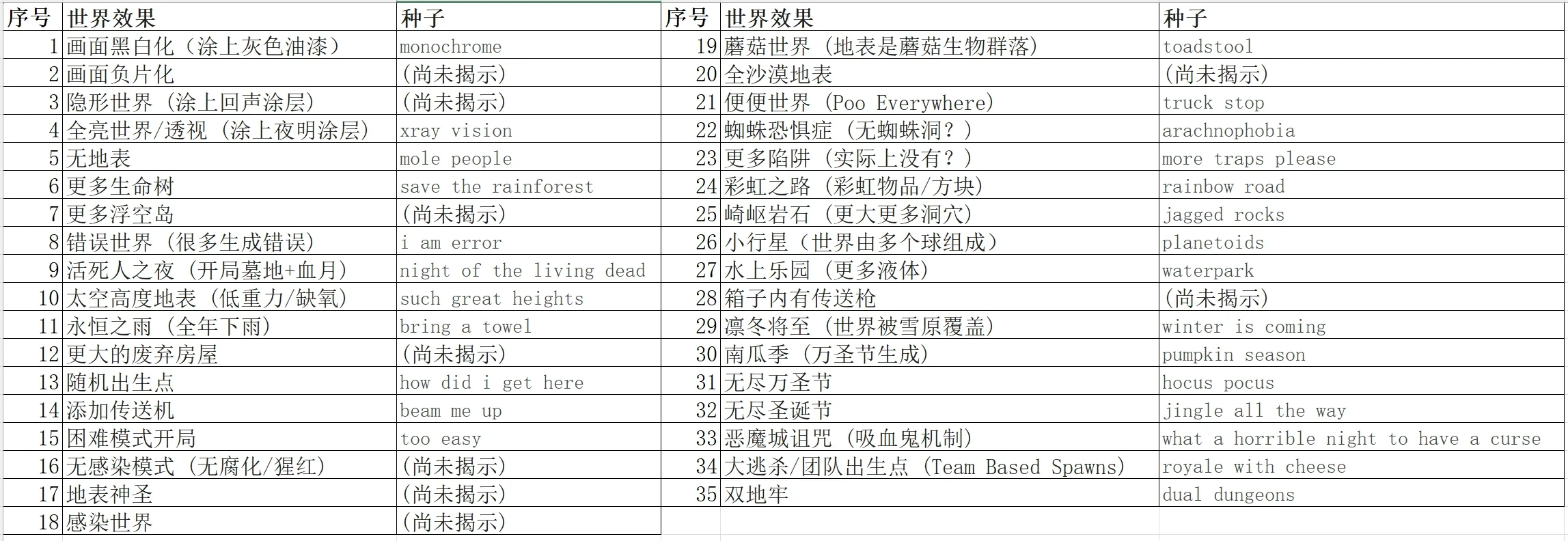 1.醉酒世界 种子: 05162020 5162020 醉酒世界的世界种子是为了纪念泰拉瑞亚发售的九周年纪念日和1.4.0.1版本的发售日期。 世界特性: 在此种子中,两种邪恶生物群落、任何具有两种变种的矿石的全部两种变种均会生成。派对女孩代替向导成为初始 NPC,地牢入口会生成于漆成棕色的生命树下。在生成世界中的描述和提示变成每一嘀嗒都会改变的随机数字(“正在放置机关”除外)。背景