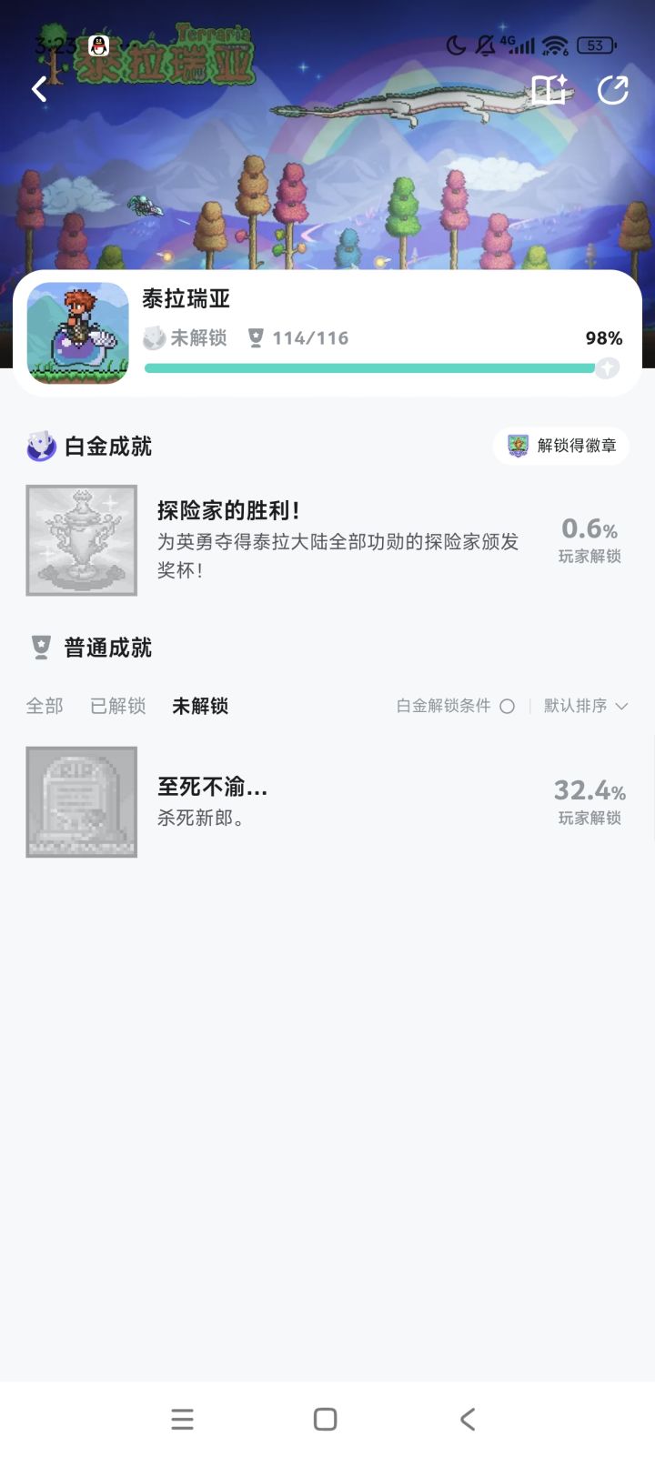 明明游戏里完成了这个成就,但是到了taptap平台却显示没完成,已经困惑了很久了,希望官方能给点说法#泰拉瑞亚