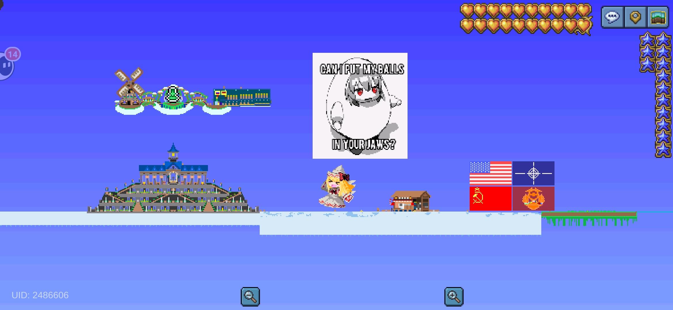 我们车万人是这样的DA⭐ZE*不要问我要地图QWQ这张地图一开始是我朋友的,但后来他就成了我们俩的共用存档,部分建筑不是我建的,像素画基本都是我动工,虽然我不知道这张图是不是我最出名的,但一定是我最不会忘记的,发帖留纪念#泰拉瑞亚 #泰拉瑞亚存档 #发现好游戏 #游戏日常 #低技术力 #文艺复兴