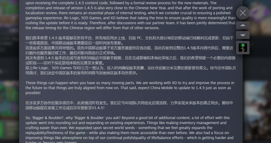 我们原本希望 1.4.5 版本能够在所有平台、所有地区同步上线,目前 PC、主机和大部分地区的移动端已经顺利完成更新;但由于一些客观原因,中国移动端版本需要延后一段时间发布更新。这是由多方面因素共同导致的。首先中国移动版基于官方服务器提供在线功能,因此在收到完整的1.4.5版本内容代码后,需要进行额外的服务器迁移工作,随后对新内容进行正式审核。其次考虑到 1.4.5 版本的完成与发布时间临近中