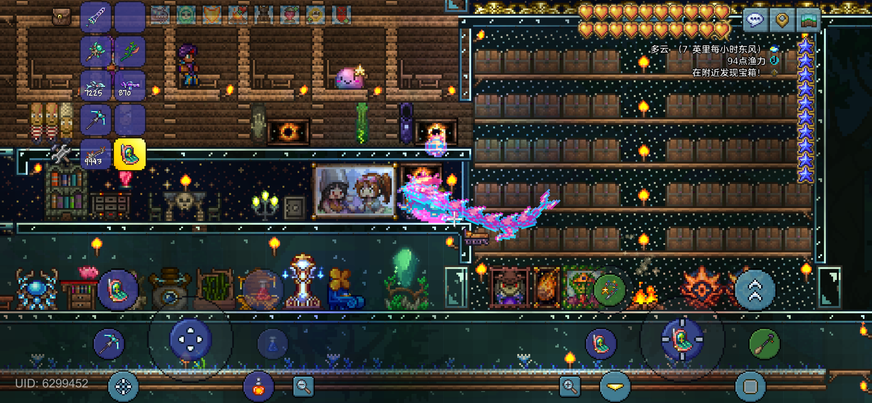 深夜,我点开了泰拉瑞亚。三年多没碰了,这款游戏一直在我手机里没卸载也没清除过数据。这次一登上去就要我更新,更新完了之后存档没了,唉,我的神家啊!云端也没有,但是人物还在,于是我就登了上去,天顶剑、毕业召唤套和战士套、无限微光桶、一千多发叶绿弹、光女掉的光剑,等等好用的神器,全在我背包里,甚至还有五个光女宝藏袋,看起来我上次关游戏前是在刷光女。新建一个世界,马上把肉山打死,然后速通其他boss。