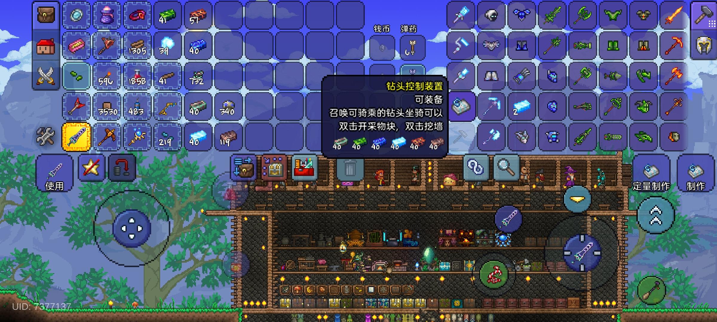 是学生党,因为高中学业太重,一周只能回家一次,但因为真的很喜欢玩泰拉瑞亚所以就断断续续玩。想起跑图的时候运气很好,在地图最侧边的世界树下找到了剑冢,开出了泰拉魔刃,又在最左侧挖出了剑冢,开出了附魔剑;之后学校怕我们压力太大自杀,就改成了休2天,时间宽裕了,就扩建了基地如图一所示,入驻的npc也渐渐多了,就在基地旁边建了列火柴盒,如图二所示,后面知道了晶塔和npc的喜好就分开住了;元旦放假三天,精