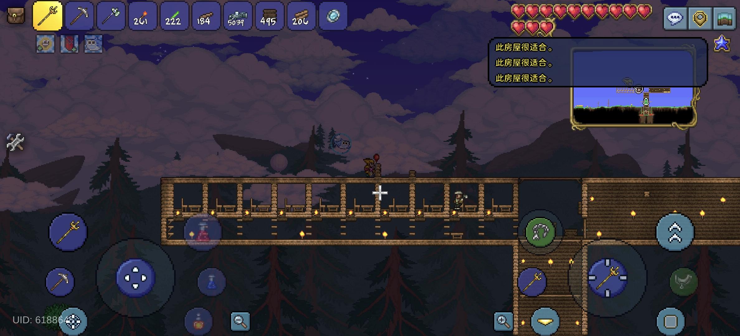 是学生党,因为高中学业太重,一周只能回家一次,但因为真的很喜欢玩泰拉瑞亚所以就断断续续玩。想起跑图的时候运气很好,在地图最侧边的世界树下找到了剑冢,开出了泰拉魔刃,又在最左侧挖出了剑冢,开出了附魔剑;之后学校怕我们压力太大自杀,就改成了休2天,时间宽裕了,就扩建了基地如图一所示,入驻的npc也渐渐多了,就在基地旁边建了列火柴盒,如图二所示,后面知道了晶塔和npc的喜好就分开住了;元旦放假三天,精