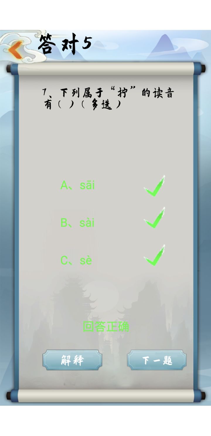 另外就是报个错,第二关第7题,个人猜测应该是“塞”的读音,题目是和第8题一样,问的“拧”的读音。