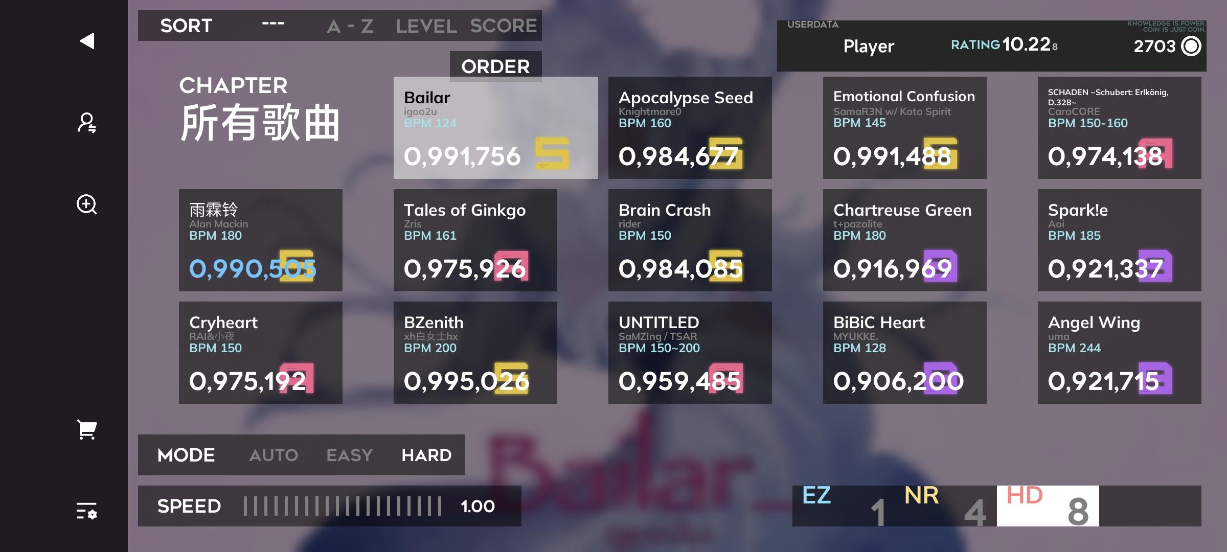 因为是大龄音游人➕去年前从来没玩过音游➕二指党,成绩不算特别优秀,但我个人算是比较满意了有点虚高10以下基本s(有一些全连,但基本没凹满分),10+的话,双指铺基本A,多指差一点点A,个别S,11及以上不太敢打,,,有几首A的,也有B(那几首魔王肯定是B了啊啊啊啊)希望明年可以进新手村(˵¯͒〰¯͒˵)号丢了好几个,这是换平板以后打的了,也算真实水平吧比较菜菜_(:з」∠)
