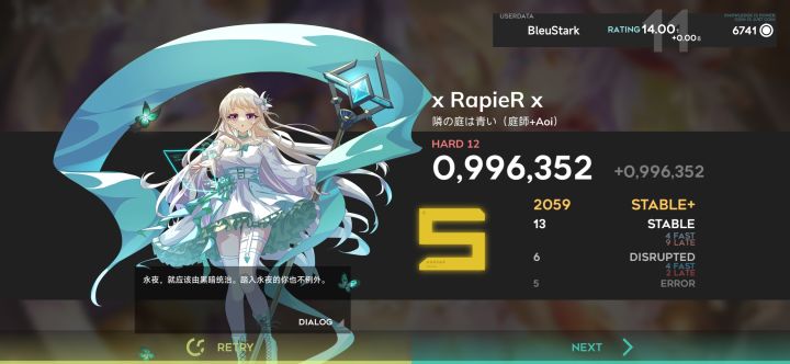 Orzmic的神曲,Le Porteur d'Ombre有谁不爱这次花了几个月的时间解锁(我非常好奇为啥我能花几个月的时间......),并在二见的时候成功FC了normal难度另外就是一个就是Orzmic的bgm,非常好听的曲子,本来想一口气推AP的,但想想还是算了。另外总感觉听得像是个悲伤的故事?