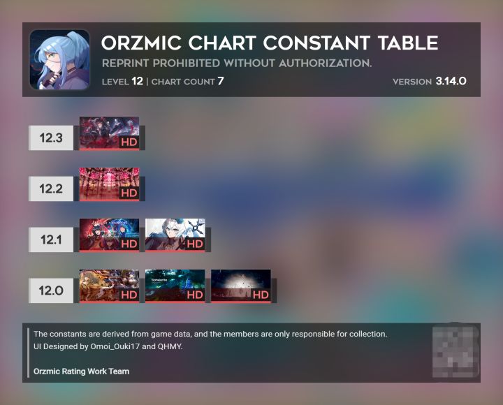 #orzmic 花了点时间更改了定数表样式(并非最终版),改版如图一,旧版为图二。如果之后没有问题的话,以后就会采用改版图了。不过由于一些原因限制,本人不会再在这里分享定数表(之前莫名被提示违规),给想在这里知道定数大家造成的不便请大家谅解。我们在其他地方见。