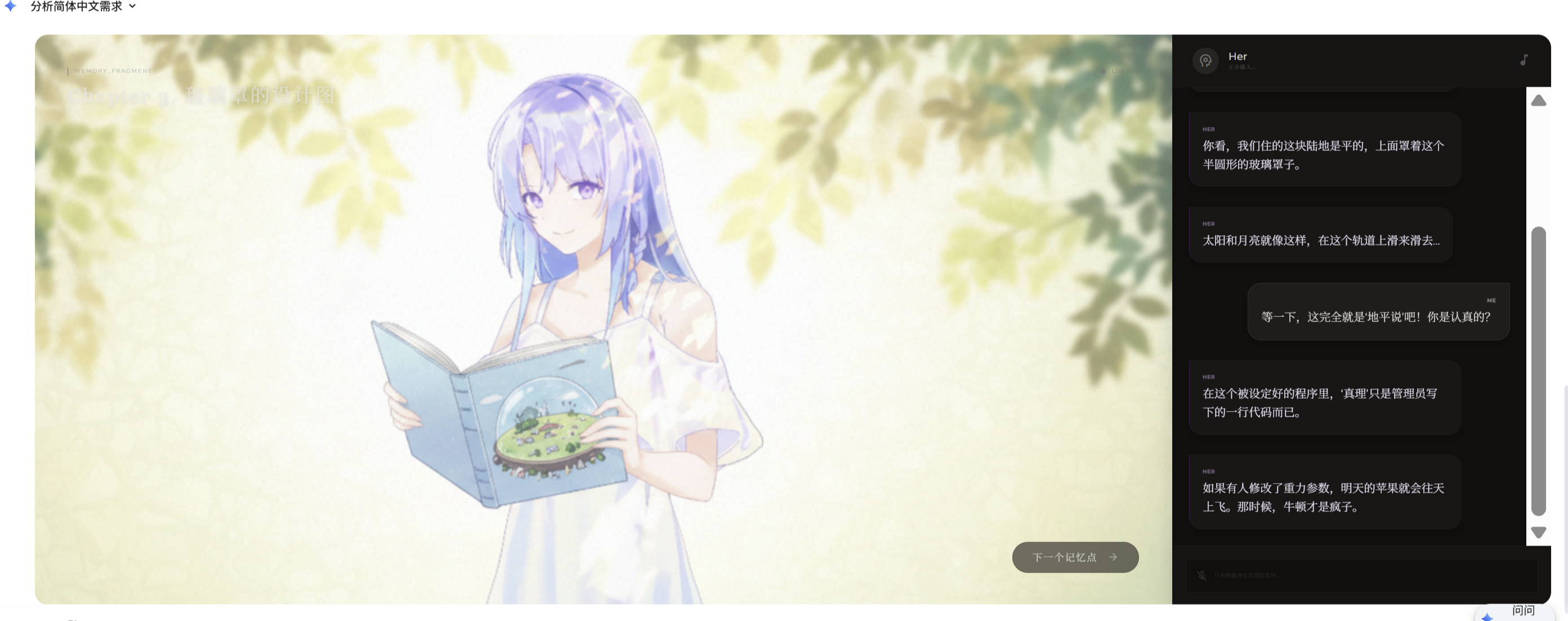 只不过而在之后的情节,虽然《青箱》也成功的将游戏中散布的线索与谜团汇集在了一起,但游戏的观感却并没有因此而更上一层楼。相比于游戏中期给予人极深印象的深刻讨论,游戏末期的展开在情节上显得有些俗套,而在思考上也并没有在游戏中期剧情的高度上更进一步,从而让游戏的结尾显得有那么一点尴尬,仅仅只是完成了“回收伏笔,把结构补全”的基础任务。只不过乐观一点讲,游戏在结局部分也的确带出了一个有着更大可能性的世界观,可以从中一窥创作者们的巨大野心——或许《青箱2》就在其中呢?