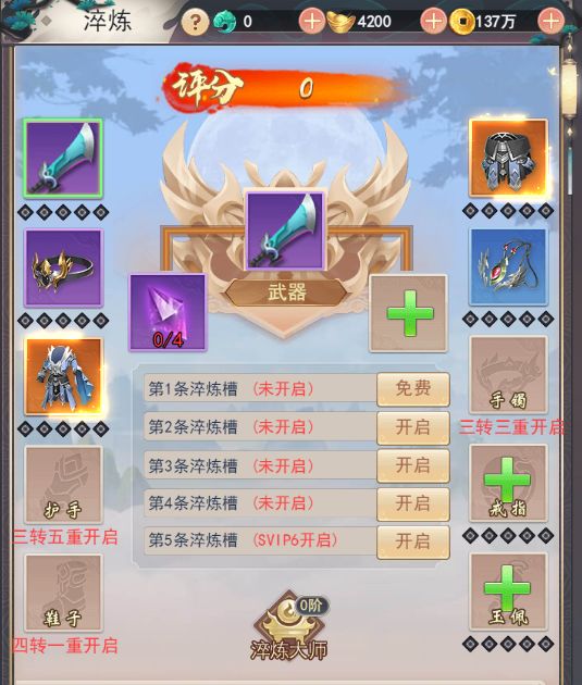 装备的好坏很大程度上决定了角色战斗力的高低,虽然装备能提供一定的属性加成,但通过给装备洗炼,则可以增加额外的属性加成。而且洗炼还有另外的好处,如果对当前的洗炼所获得的属性加成不满意,可以重新洗炼直到满意为止。淬炼系统所有已经穿戴了装备的部位都可以进行淬炼,但不同部位的开启条件不同,每一个部位装备都需要玩家达到相应的转生等级才能解锁进行淬炼。每件装备都拥有5个洗炼槽,每一个洗炼槽都可以消耗洗炼