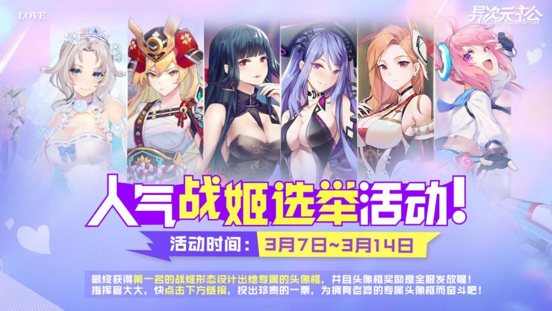 Hello,指挥官们好,这里是宁宁! 温暖的三月,我们迎来了一个重大的节日-女神节,宁宁带着满满的诚意,在这里祝各位女神们节日快乐(*^▽^*)。 说到女神节,怎么能少了指挥官们的各位老婆们呢?如果指挥官苦于平时没有机会对心仪的女神表白,就在今天,宁宁来为大家创造机会啦! 宁宁决定举办第一届【人气战姬投票】活动。《异次元主公》里有许多不同风格的小姐姐,他们不仅能力超群,外貌也十分的女神范! 比如高