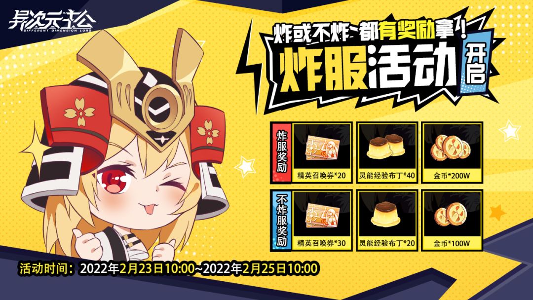 各位指挥官大人,《异次元主公》已于2月23日10:00正式公测开启!感谢大家的耐心等待,虽然前面宁宁对服务器方面做了充足的保证。但是!万一,万一万一万一因为炸服影响了各位指挥官大人的奥博世界之旅,我们也为各位指挥官大人准备了丰盛的奖励。这里请注意,是炸与不炸宁宁都会奉上特别奖励哦~这是运营组为那可能出现炸服的一小小小点机率申请的保险~ 【活动期间】2月23日10:00——2月25日10:00 如若