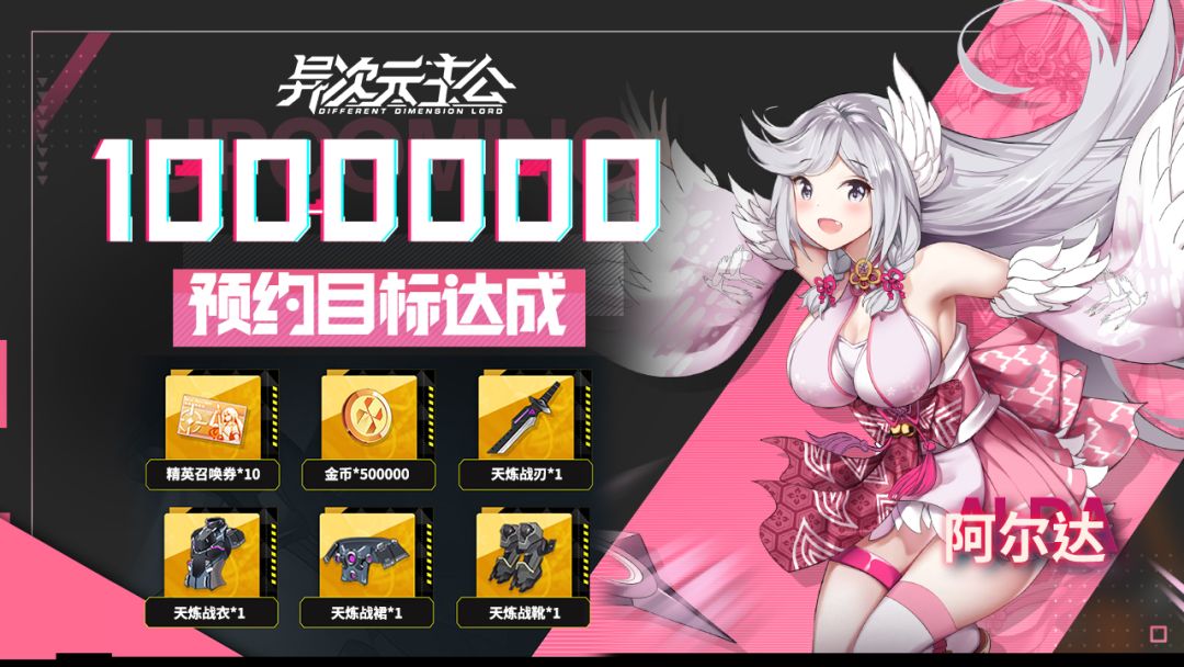 在各位指挥官们的共同努力下,《异次元主公》预约100万次达成!!(撒花✿✿ヽ(°▽°)ノ✿)已解锁全部预约奖励,感谢各位指挥官的支持~ 现在预约,开服将获得: 预约专属头像框+以下所有奖励 ◆预约达成5万次,奖励: 水晶*500、金币*50000、灵能经验糖果*20 ◆预约达成10万次,奖励: 水晶*1000、波之纹章*10、岚之纹章*10、日之纹章*10,、焰之纹章*10 ◆预约达成20万次,奖