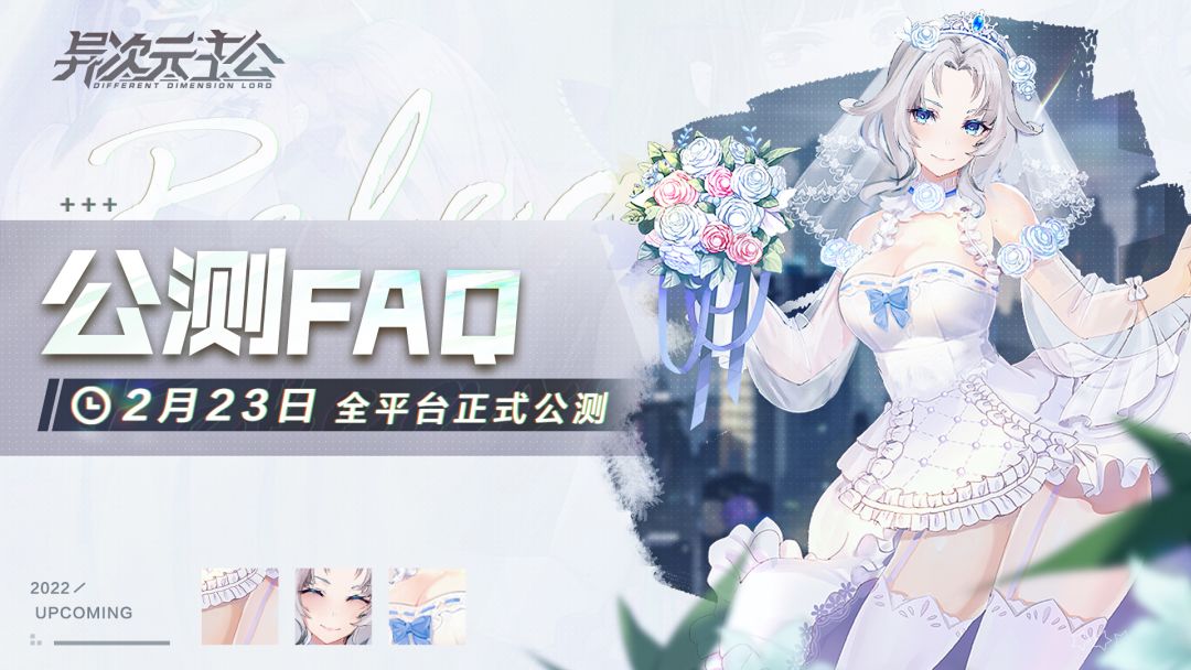 亲爱的指挥官: 为了更高效的解决大家的疑问,我们为您准备了公测必备FAQ,欢迎查阅 【公测相关】 Q1《异次元主公》什么时候可以下载?几点开服? A1《异次元主公》将于2022年2月23日10:00正式开启全平台公测。游戏双端安装包将于2022年2月22日15:00开启预下载 Q2公测的包体多大?下载、安装游戏有什么注意事项? A2游戏安装包大小在1.5G左右,手机内存3G以下可能出现无法安装、运
