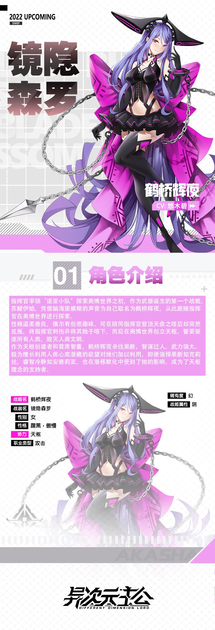 各位亲爱的指挥官~ 昨天为大家介绍了全新战姬镜隐森罗,她腹黑傲慢而又温柔善良,武力强大,杀伐果断。大家一定对她充满了好奇,她美丽飒爽的外表下还藏着哪些小秘密呢?让我们一起来看看她的详细档案吧~ 战姬名:鹤桥辉夜 战装名:镜隐森罗 职业类型:攻击型 稀有度:幻 为了方便指挥官们更好的了解这位新伙伴的信息,可以参考下详细技能介绍噢 看完这些,指挥官们有没有对她有更为详细的了解呢?