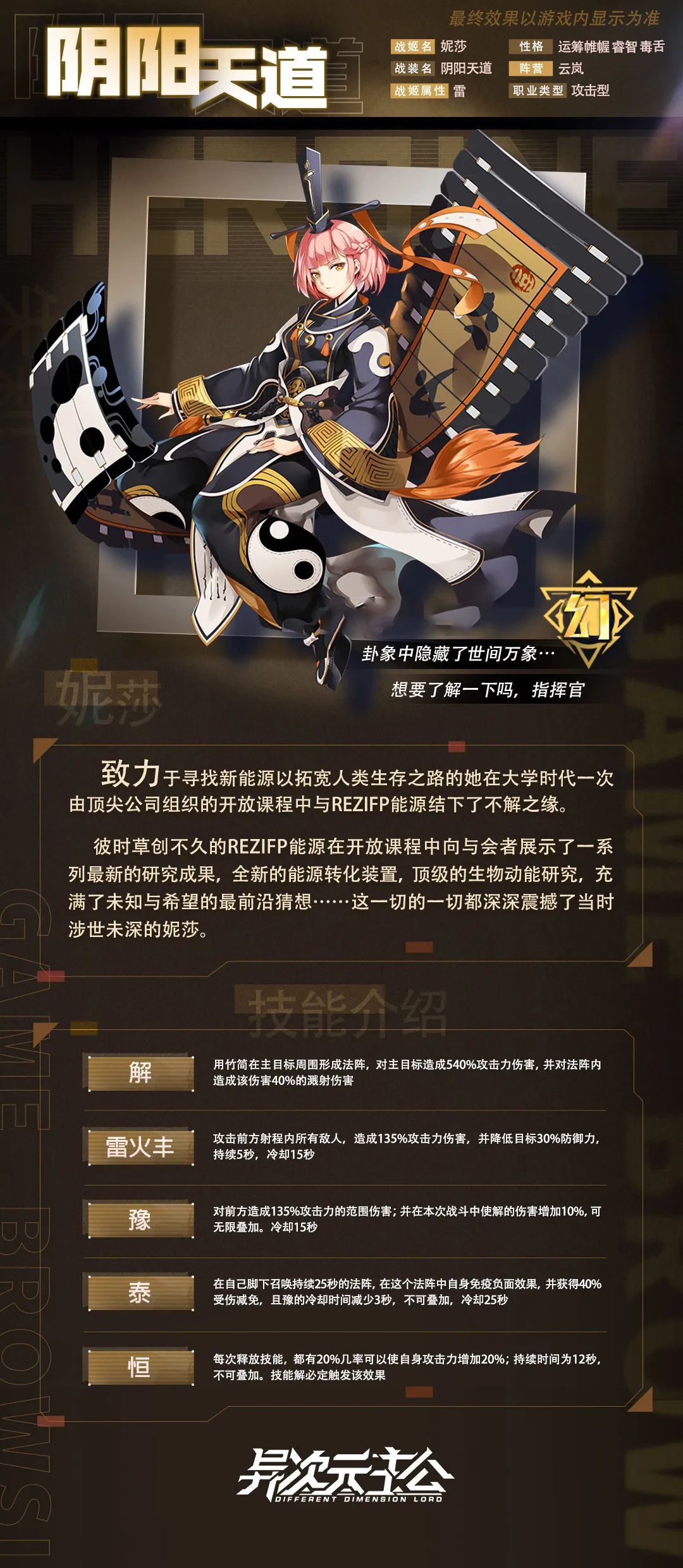 周末释出的剪影图, 有没有机智的指挥官猜出一二呢~在下要揭晓谜底了噢,她就是—— 攻击型SSR.幻战姬【阴阳天道】 又是一名强力小姐姐登场啦,技能介绍也一并附上,指挥官们可以先仔细研读一下~今晚凌晨,指挥官们可要抓紧了噢!! --------------------------------------------------------- 【阴阳天道】,妮莎的第二形态。 作为一位优秀的科研工作者,