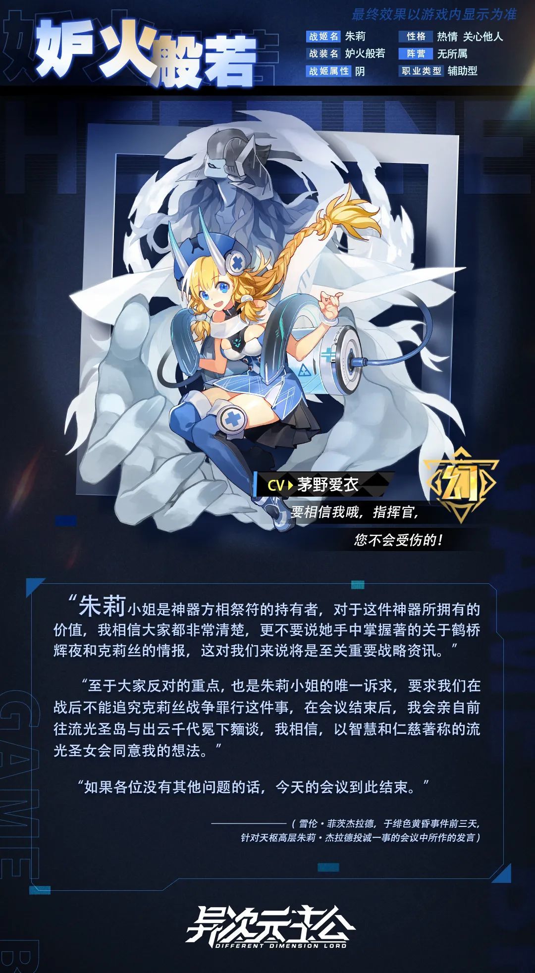 指挥官们好吖૮₍ ๑•᎑< ๑₎ა,又到了公开本周限定战姬的时候啦! 是不是感觉这周的限定很难猜呢,现在揭开谜底啦! 辅助型SSR.幻战姬【妒火般若】 她是朱莉的第三形态,在医术方面有着远超常人天赋的朱莉,生性十分善良 最喜欢克莉丝姐姐的她虽然最终投诚于云岚,仍然希望在战后不追究克莉丝的战争罪行 云岚内部于会议接受了朱莉的诉求接下来她又会有怎样的表现呢(っ `-´ c)!
