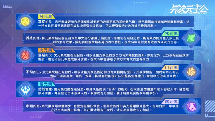 今天宁宁介绍的是战姬元素,和战姬职业、资质一样重要的噢元素分为7种:其中常见的有风、林、火、山。雷元素战姬和阴元素战姬属于比较稀少的两种元素,但实力普遍强大,当然对于操作也有一定要求。指挥官拿到这两种元素的战姬后可以优先培养呢~1月17日唤醒测试就要开启啦,后续将会放出测试下载地址,请持续关注宁宁发出的最新消息吖-----更多官方信息-----《异次元主公》全平台预约现已开启微信公众号