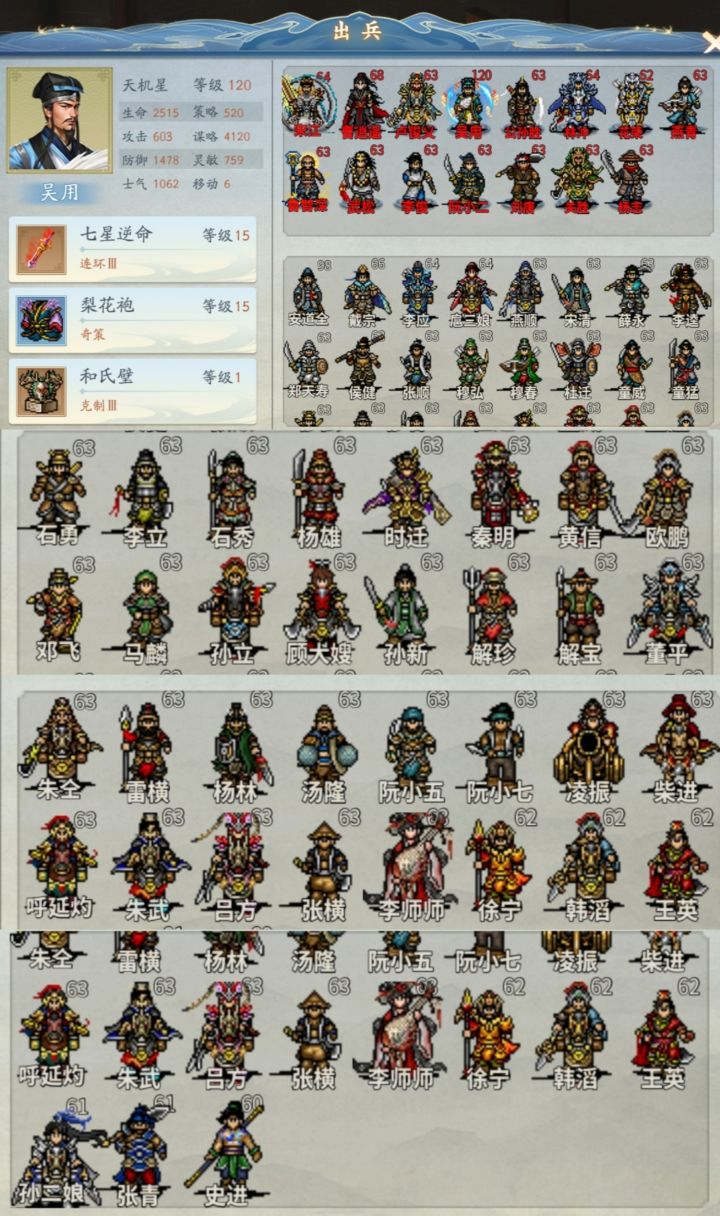 话不多说,直接进入正题:27芒砀山之战:开局吹死樊瑞过关28八卦降魔阵:插旗破阵后击退两次樊瑞过关29一打曾头市:比较蛋疼的一关。难点有二:神一样的史文恭,猪一样的晁盖。平民打法:一人带圣龙灵神刑天衣龙皮,一动往寨子方向靠近拉怪,吹完。二动落脚点在史文恭出现点正上一格,史文恭一出来即可时停定住。瘸子晁盖慢慢往左下走,可配合回归。跟一个高移动酱油过去方便拉怪。等晁盖走过谷底触发左上伏兵,酱油往