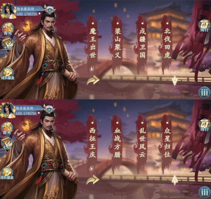 考验一:指定区域杀怪2波,杀邪神——刘唐、朱仝加入考验二:3孤竹君——李师师、赵元奴加入考验三:击败3人——李应、卢俊义下回合加入考验四:4军形篇——晁盖、孙立加入全部考验完成,龙女加入关于妖王:妖王不死,小兵无限复活(36,11)附近,“狼王”带兵(16,20)桥梁附近,以及桥梁右侧平原荒地,触发水寇,全灭后“鬼王”带兵出现。(7,17)-(9,19)附近,怨灵一波,全灭后出现“