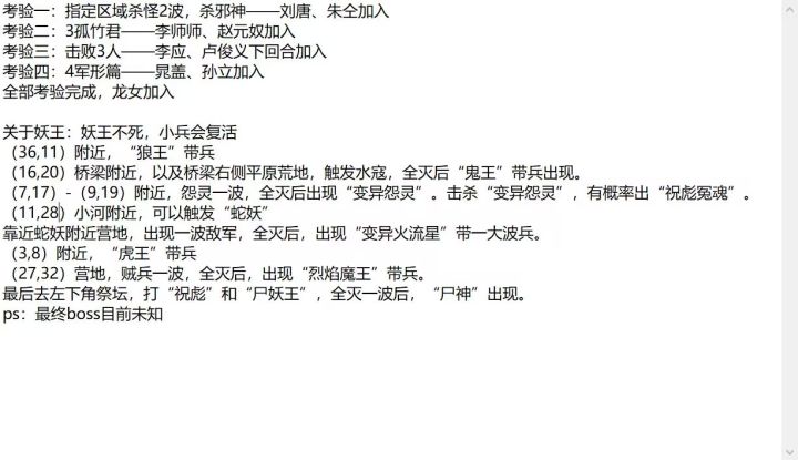 考验一:指定区域杀怪2波,杀邪神——刘唐、朱仝加入考验二:3孤竹君——李师师、赵元奴加入考验三:击败3人——李应、卢俊义下回合加入考验四:4军形篇——晁盖、孙立加入全部考验完成,龙女加入关于妖王:妖王不死,小兵无限复活(36,11)附近,“狼王”带兵(16,20)桥梁附近,以及桥梁右侧平原荒地,触发水寇,全灭后“鬼王”带兵出现。(7,17)-(9,19)附近,怨灵一波,全灭后出现“