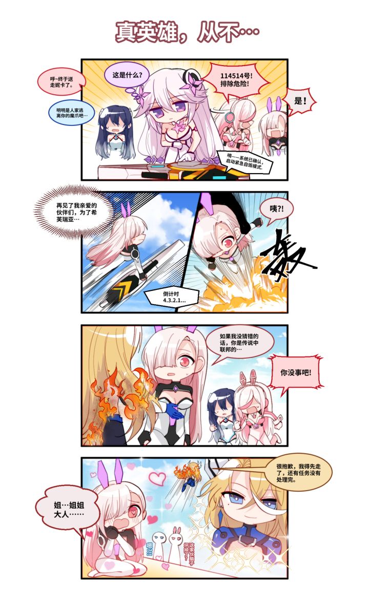 《青空之刃》最新四格漫画 | 团长不在的希芙瑞亚 ——第30话《真英雄,从不……》这里是希芙瑞亚号,隶属于绯金佣兵团的高性能强袭登陆舰。保证这艘战舰高效运作的关键在于3位特殊的Rho型AI——担任舰长、聪明知性的茜,担任秘书、伶俐能干的爱茵,以及具备最强战斗力的玲奈。她们表面相亲相爱,实际上……实际上也很相亲相爱。虽然团长大人外出了,但玲奈、茜和爱茵以及她们的伙伴们会守护(?)希芙瑞亚,并等待着