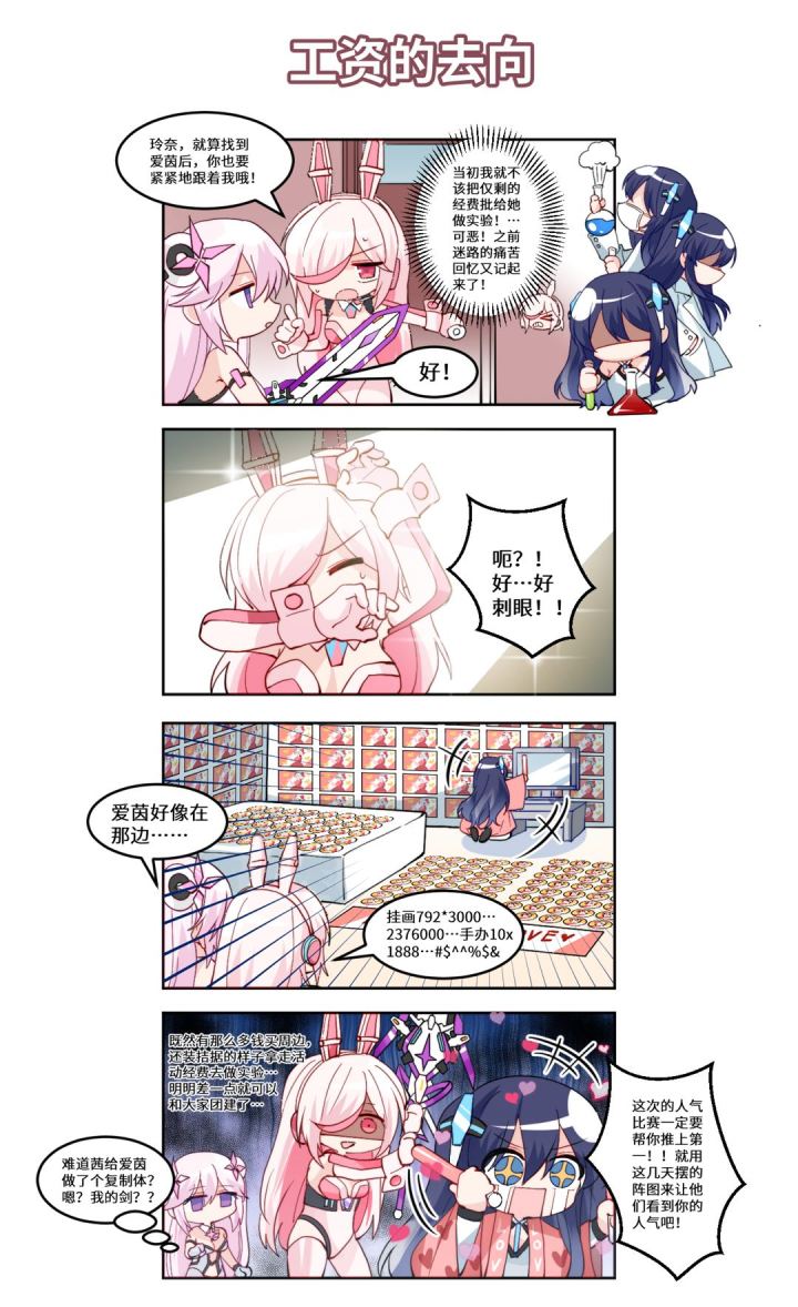 《青空之刃》最新四格漫画 | 团长不在的希芙瑞亚 ——第24话《工资的去向》这里是希芙瑞亚号,隶属于绯金佣兵团的高性能强袭登陆舰。保证这艘战舰高效运作的关键在于3位特殊的Rho型AI——担任舰长、聪明知性的茜,担任秘书、伶俐能干的爱茵,以及具备最强战斗力的玲奈。她们表面相亲相爱,实际上……实际上也很相亲相爱。虽然团长大人外出了,但玲奈、茜和爱茵以及她们的伙伴们会守护(?)希芙瑞亚,并等待着团长归