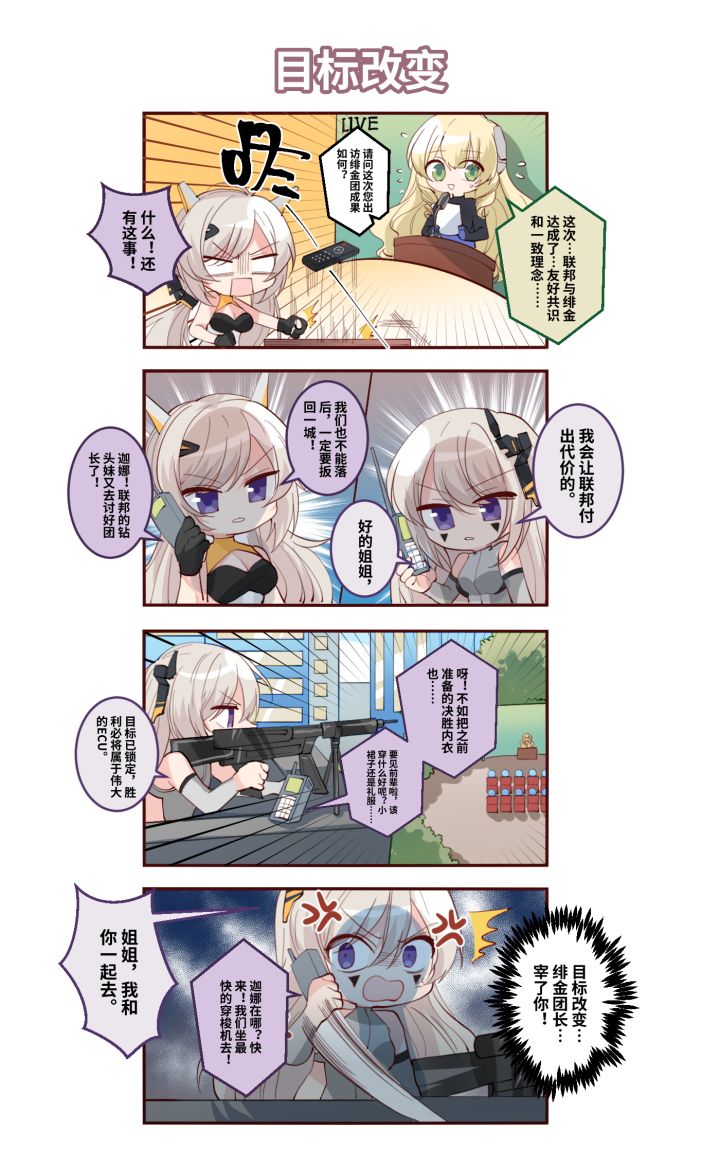 《青空之刃》最新四格漫画《团长不在的希芙瑞亚》——第19话《目标改变》这里是希芙瑞亚号,隶属于绯金佣兵团的高性能强袭登陆舰。保证这艘战舰高效运作的关键在于3位特殊的Rho型AI——担任舰长、聪明知性的茜,担任秘书、伶俐能干的爱茵,以及具备最强战斗力的玲奈。她们表面相亲相爱,实际上……实际上也很相亲相爱。虽然团长大人外出了,但玲奈、茜和爱茵以及她们的伙伴们会守护(?)希芙瑞亚,并等待着团长归来。我
