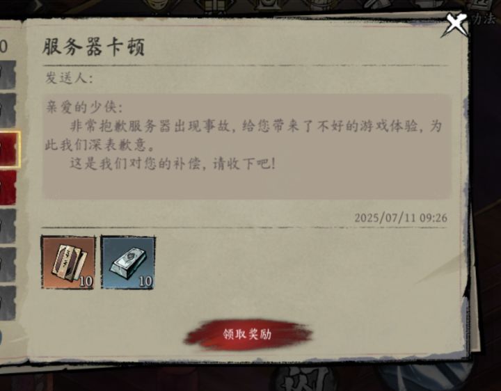 亲爱的少侠们,感谢您对我们游戏的热爱与支持!由于服务器波动,玩家在刚才短暂时间段的登录过程中遇到了困难。经过我们的紧急排查与修复,目前问题已解决,正在游戏内的玩家并未受到影响。为表达我们的歉意与感谢,我们为各位少侠准备了一份福利礼包,请查收~补偿邮件:无字典籍*10、玄铁锭*10邮件领取截止时间:2025年7月14日00:00