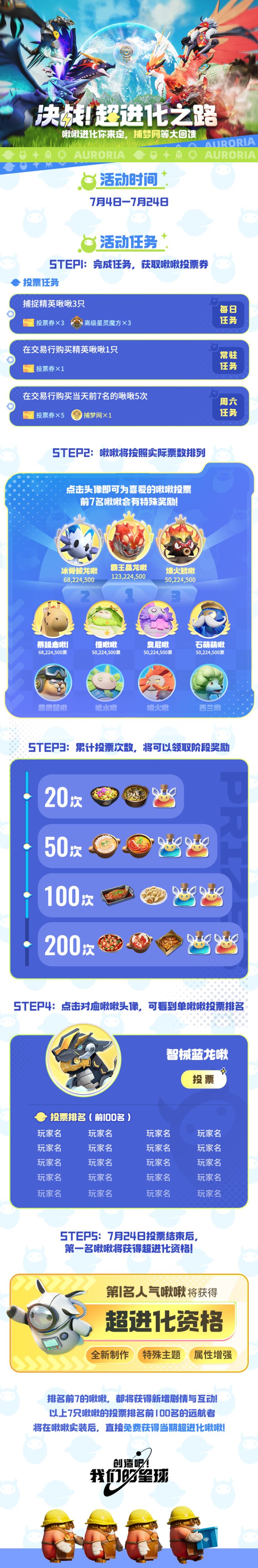 参与活动,为心爱的啾啾投票,助力TA踏上超进化之路!周末参与还能得夺宝道具捕梦网!